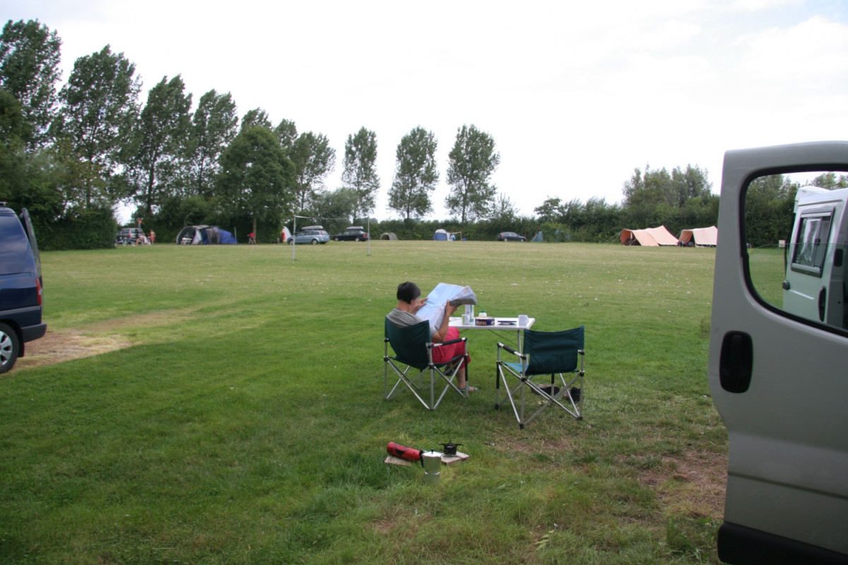Beaucoup de place ici, le prés restent toujours libres au centre, le camping est plein quand toutes les places près des haies sont prises.