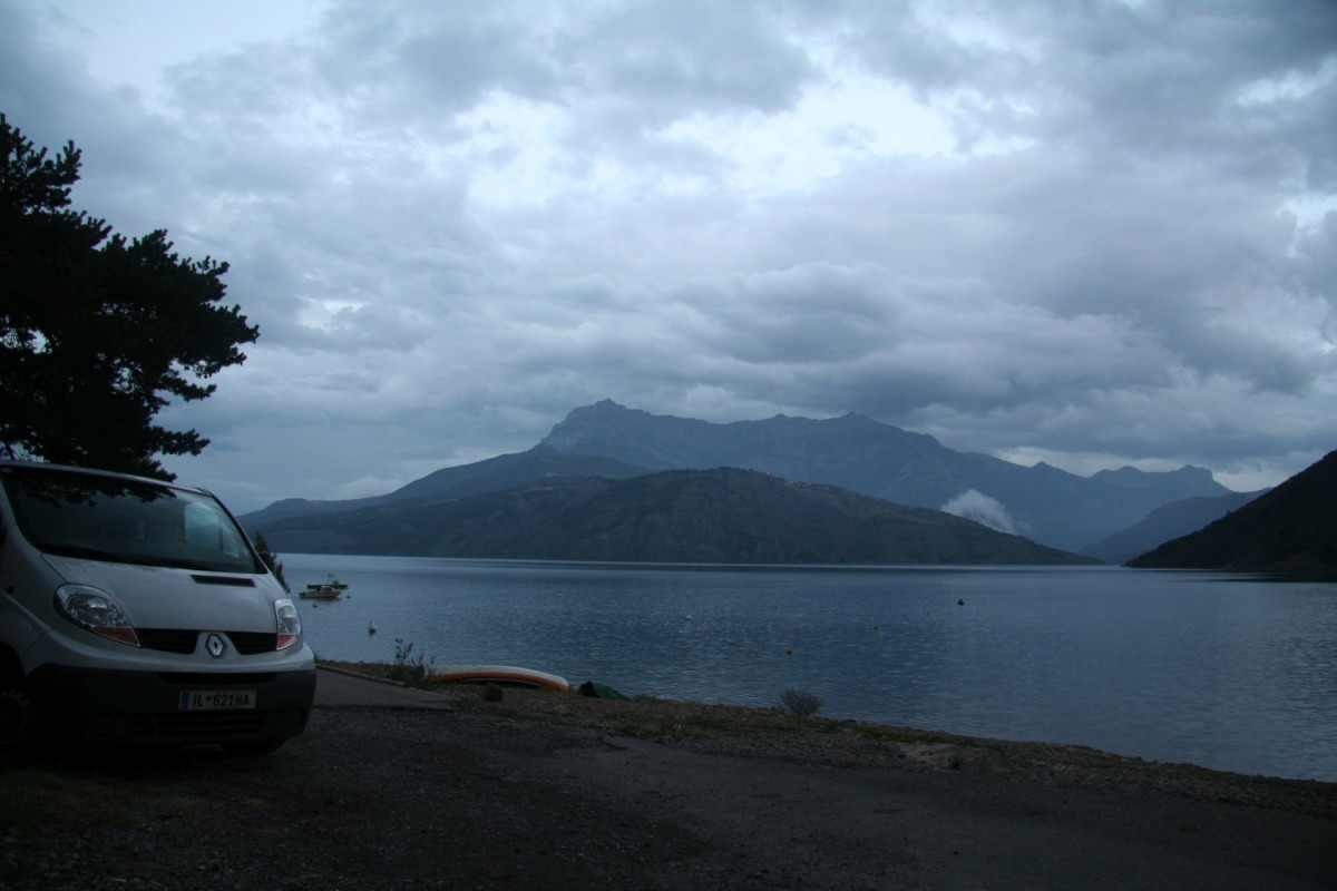 Un dernier arrêt avant de rentrer au Tyrol par Briançon. Nous arrivons lorsque la pluie commence à tomber. Il fait encore chaud, nous nous baignons dans cette pénombre.