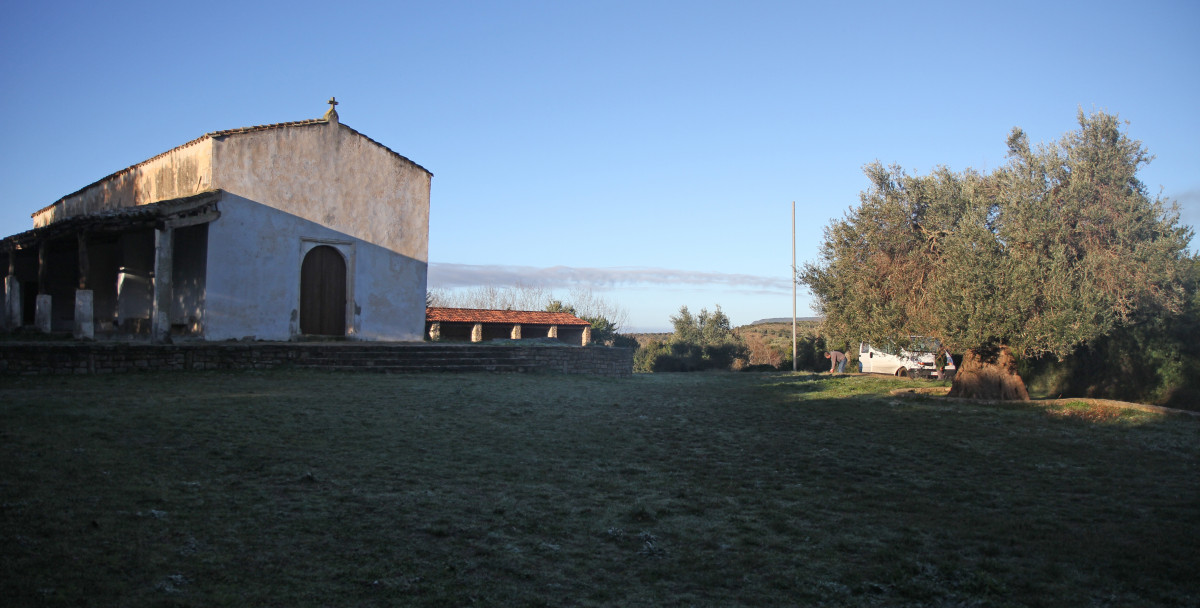Nous avions passé le reste de la journée précédente à la plage jusqu’au coucher de soleil et utilisons ces heures de la nuit pour rallier le centre de l’île pour visiter les sites néolithiques de Su Nuraxi et Santa Vittoria le jour suivant. Il n’y a pas de grande ville autour, mais on aura quand même quelques problèmes à trouver un endroit pour passer la nuit correspondant à nos exigences (loin de la route, quand même pas trop caché pour profiter du soleil matinal s’il est là, plat, accessible sans 4×4 etc.). Le parking de Su Nuraxi est juste à côté de la route et très en pente, il y a pas mal de petites routes agricoles goudronnées menant loin dans les collines mais il est presque impossible de quitter ces bandes de goudron (murs, parois, végétation ou simplement boue). À plus de 12km de Su Nuraxi, nous repérons une église en rase campagne et c’est là que nous passerons la nuit tranquilles. Seul défaut de passer à l’intérieur des terres: le thermomètre chute et nous atteignons les 0°C. Mais le matin le soleil est là!