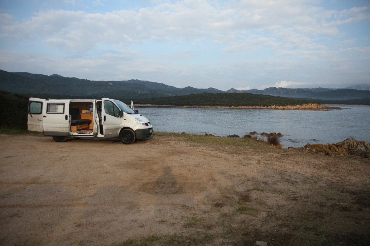 Nous étions arrivés à la tombée de la nuit en Sardaigne, il n’y avait plus de lumière pour rechercher une meilleure place. C’était finalement pas mal. Le matin un garde du parc naturel passe, mais il ne nous interpelle pas bien que nous soyons directement garés sous un panneau d’arrêt interdit.
