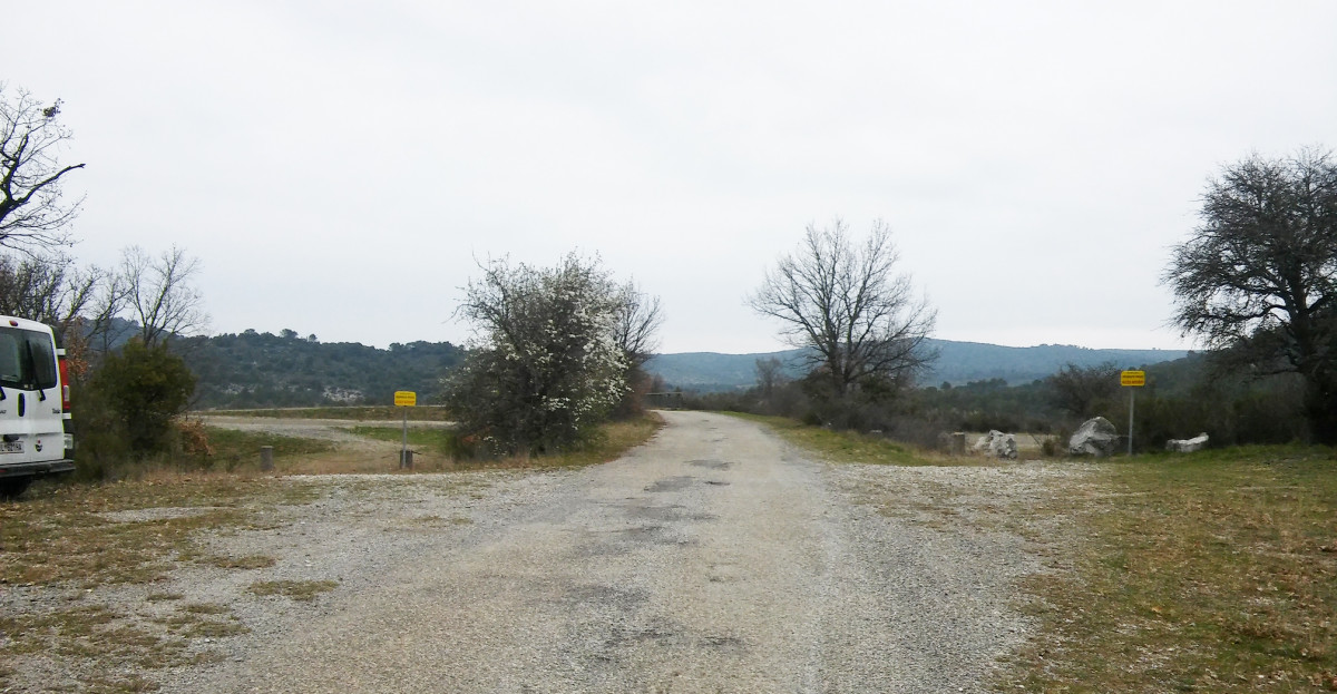 La route monte sur un pont passant au nord du canal et mène sur le Chemin de la Mouroye. On vient en général de la Route de Vinon (D69). Les panneaux interdisent d’approcher les abords du canal, le passage sur le pont est autorisé. Zone vague, sans vue spéciale, mais très tranquille.