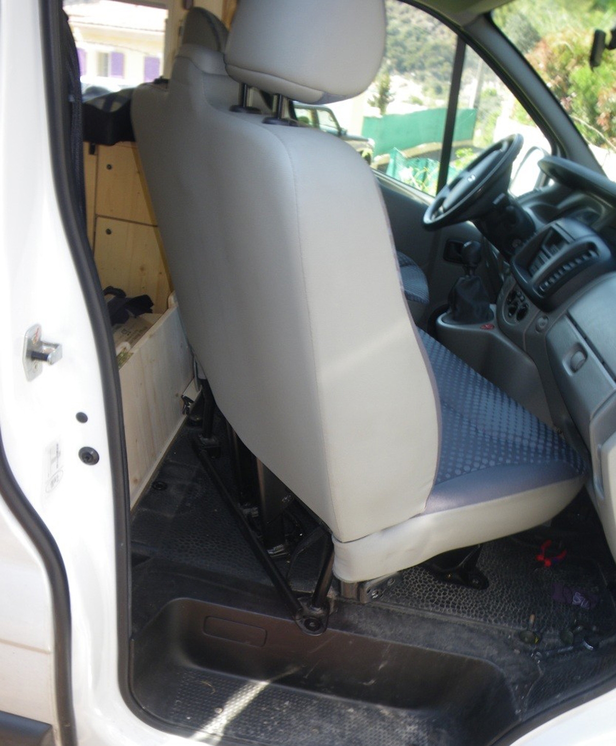 Und bei der Suche nach einem Beifahrersitz fangen die Probleme an. Nein, es geht nicht um das Stoffmuster des Bezugs. Neu sind solche Sitze samt Sockel nur um vierstellige Euro-Beträge zu haben. Gebraucht sind sie kaum am Markt vorhanden. Erstens weil die Nachfrage so gross ist, zweitens weil die meisten Fahrzeuge als LKW im Umlauf sind und somit eine Bank vorne haben. Der Fahrersitz wäre zwar verbaubar, aber aus zwei Gründen kommt er kaum in Betracht: in den LKW-Versionen ist er meistens zerschlissen und die eine Armlehne ist beim Wechsel auf der falschen Seite. Diese Lehne kann man nicht einfach umstecken, dessen Achse ist an den Rahmen geschweisst. Abtrennen und darauf verzichten geht allerdings.